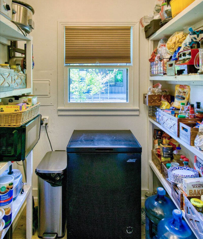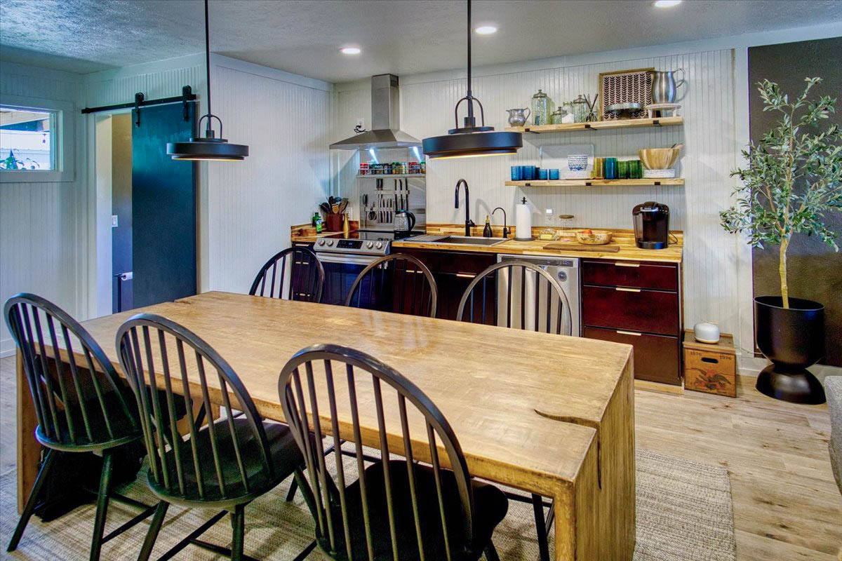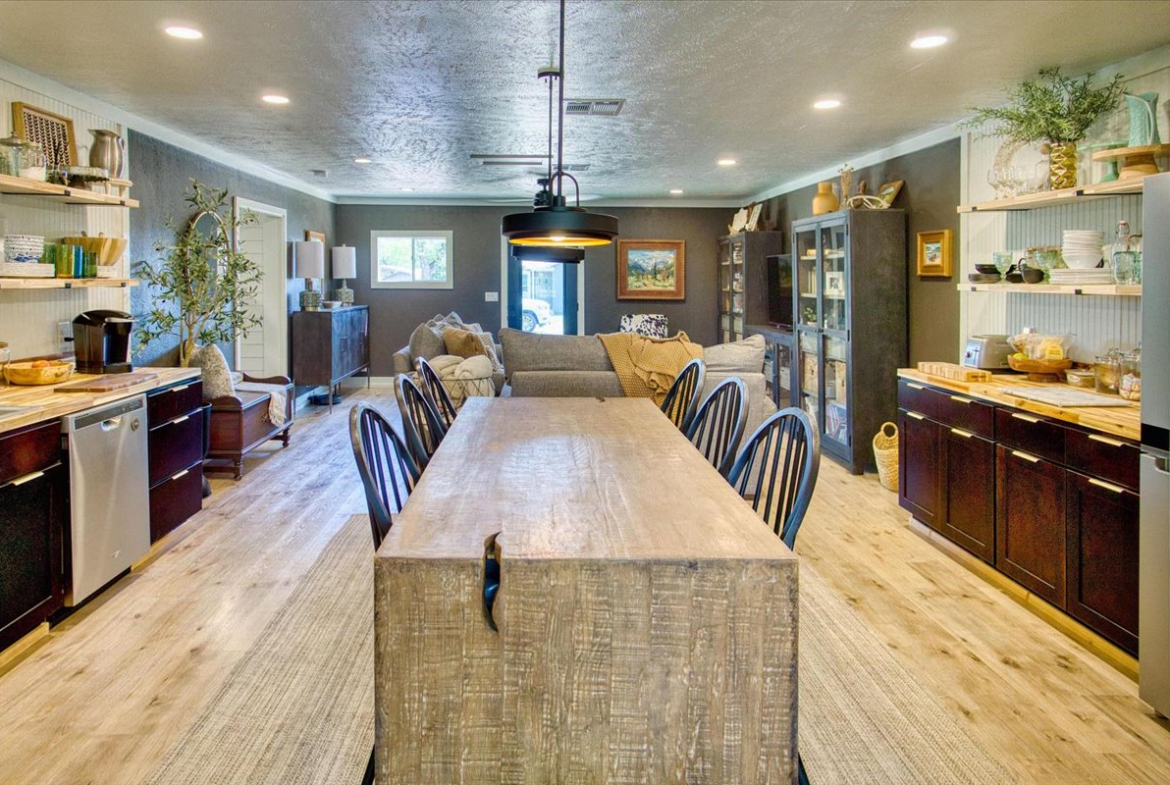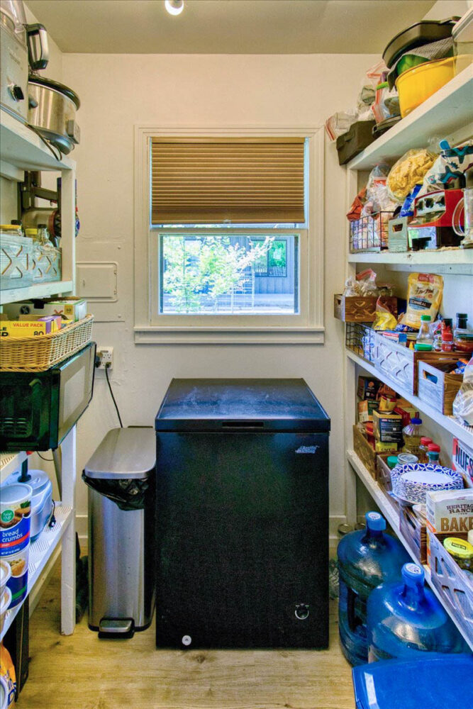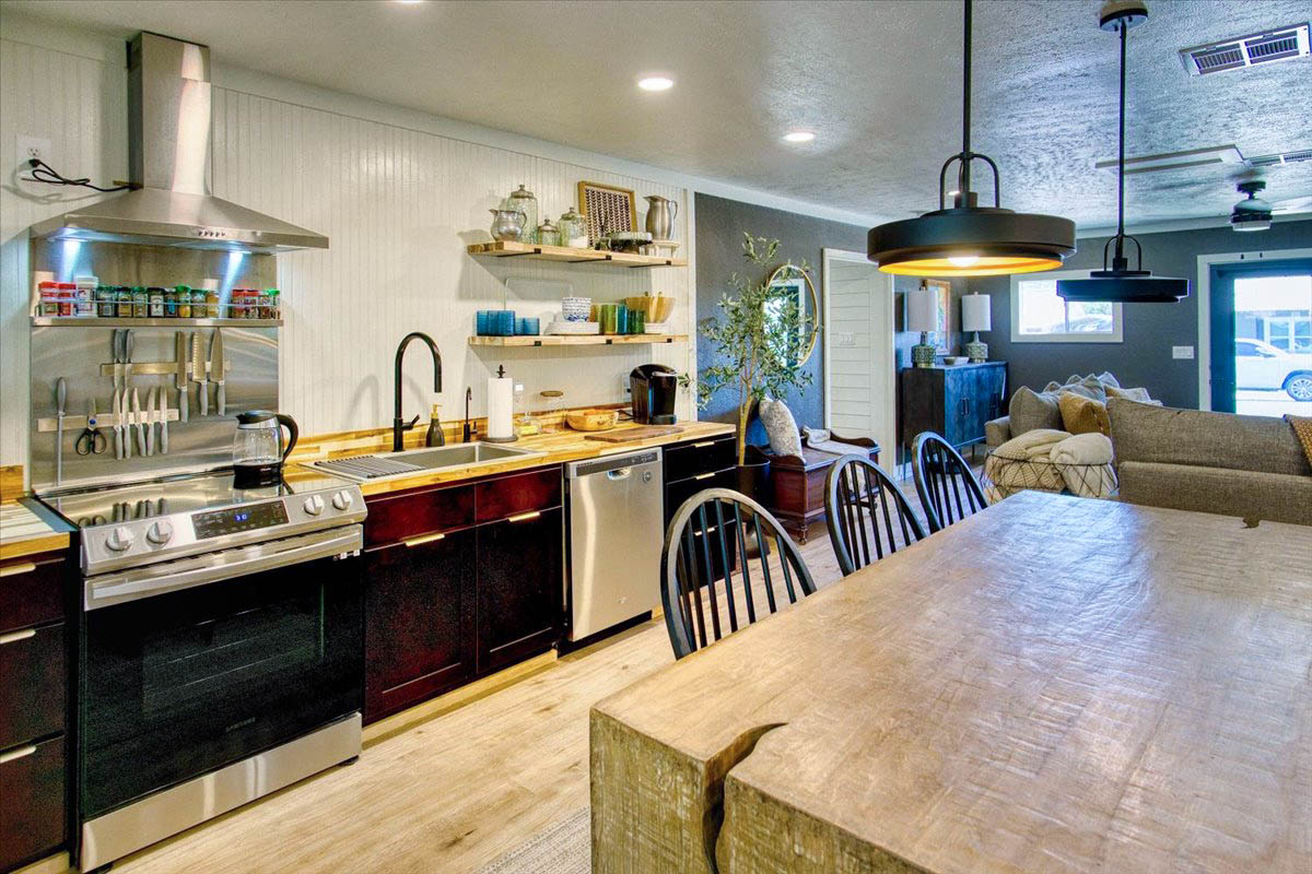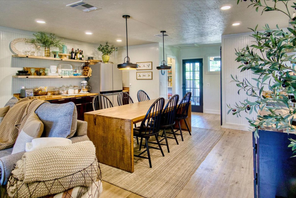 The kitchen is a standout with beautiful floating cabinetry, sleek modern appliances, a large stainless-steel sink, warm butcher block countertops and walk-in pantry make cooking and entertaining a pleasure.
