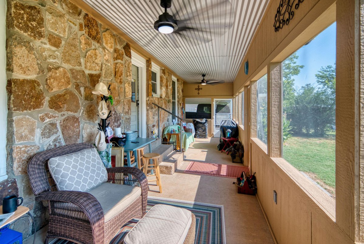 Outside, a screened porch with ceiling fans overlooks a fenced backyard full of fruit trees—peach, apricot, and fig—as well as a thriving garden area. The air-conditioned shop provides extra space for laundry, storage, or hobbies, and the carport offers covered parking.